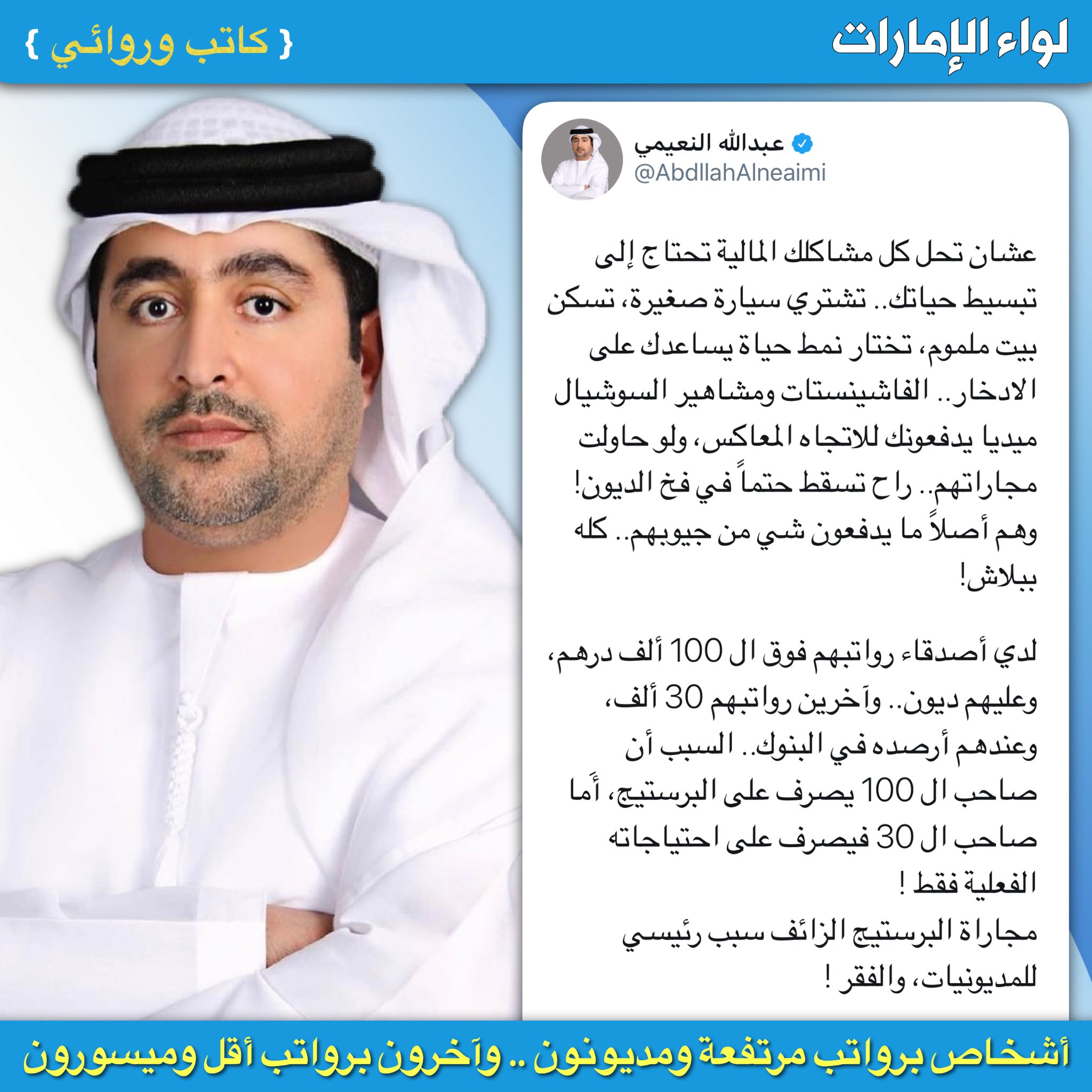 لواء الإمارات الإخبارية Auf Twitter تغريدة الكاتب عبدالله النعيمي يغرد بنصائح قد تساعد في حل المشاكل المالية للفرد ويضرب بعض الأمثلة والأسباب أشخاص برواتب مرتفعة ومديونون وآخرون برواتب أقل وميسورون Https T Co Lkrwjtyeud