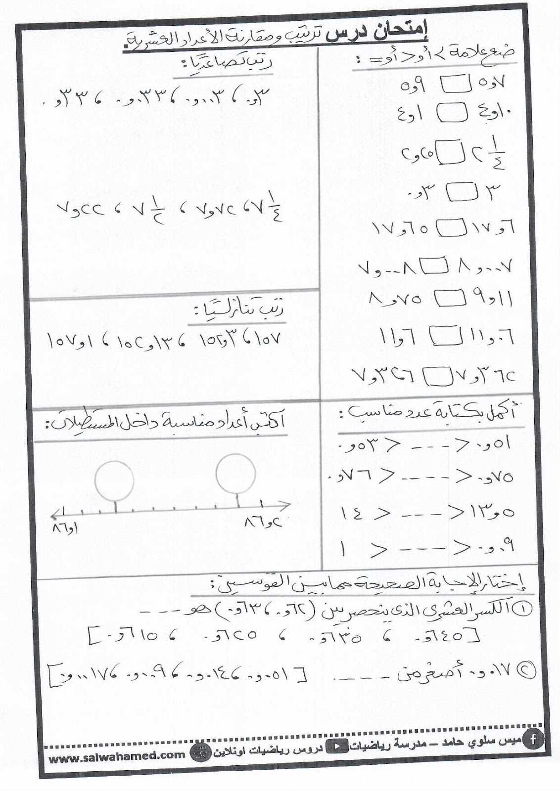 ترتيب ومقارنة الاعداد العشرية للصف الرابع الابتدائي مدونة ميس سلوى حامد
