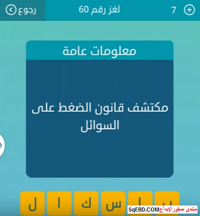 جواب سؤال مكتشف قانون الضغط على السائل من 6 حروف من لعبة كلمات متقاطعة لغز رقم 60 صقور الإبدآع